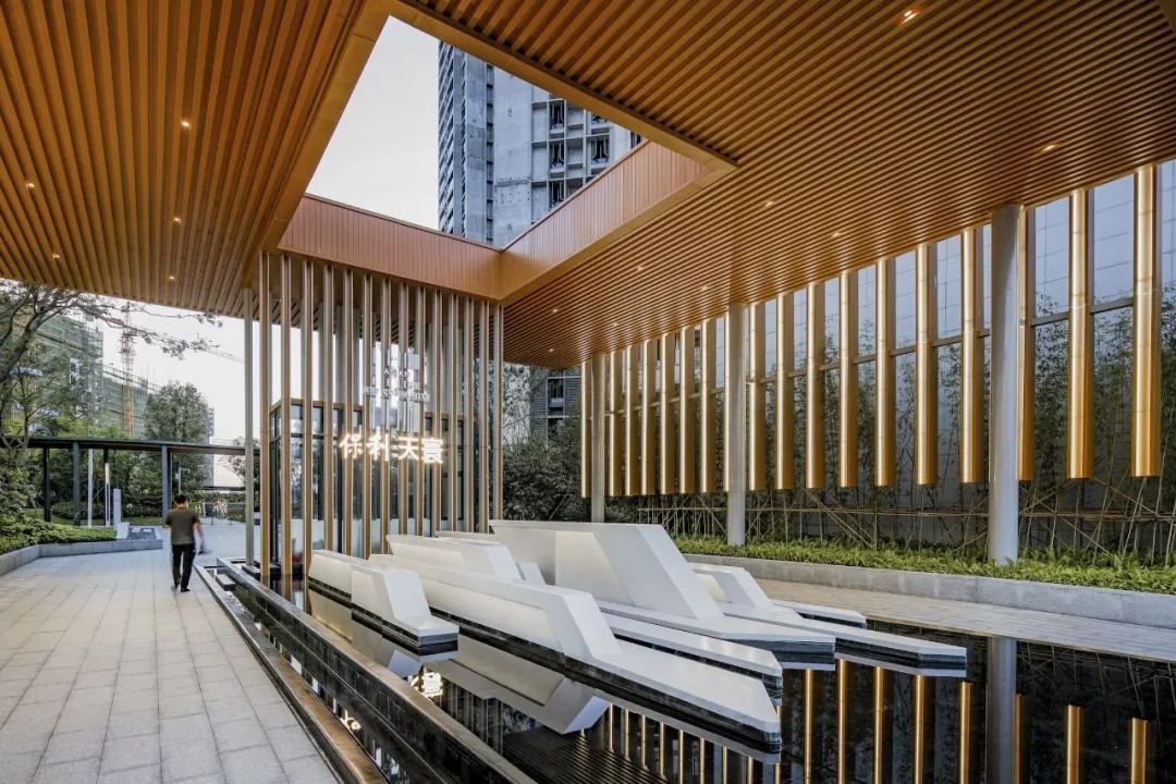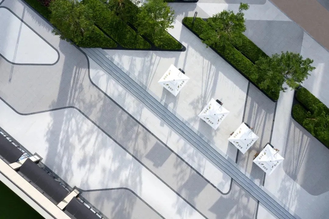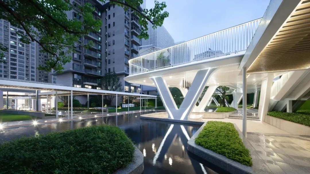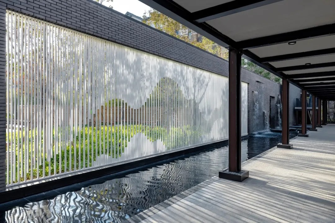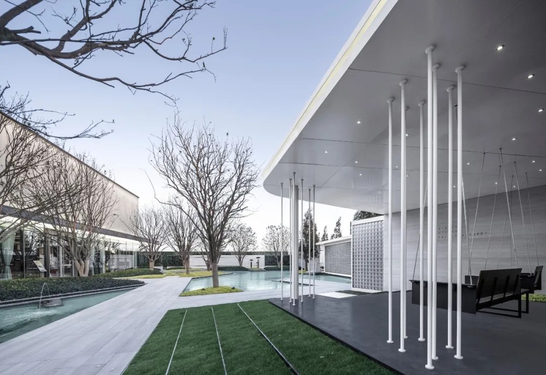 优雅灵动的线型、简洁纯净的色彩语言,富有韵律的构图,现代科技与古典美学相结合,古韵今趣,共同营造出精致简约并流动轻巧的景观建筑空间。