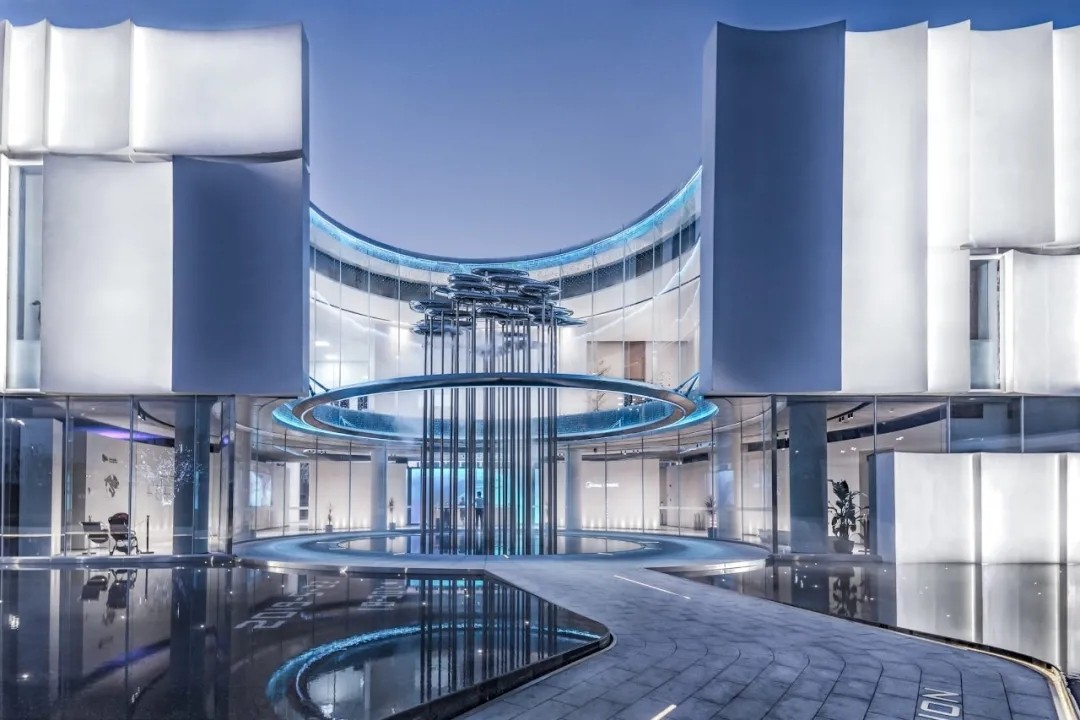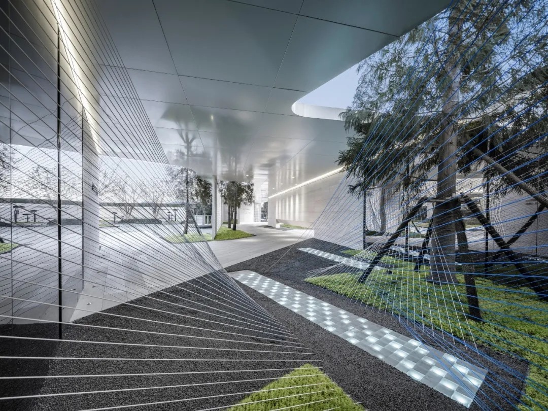 设计希望人们走进这里,看到极干净的墙,极挺拔的树,极明净的光温暖的洒在玻璃上,看到树木悠然自得的穿破云廊与水镜,看到江海岸的斗笠人追光而来,看到交织在一起如梦如幻的而又有力的云科技线,人们会看到未来生活美好的模样。