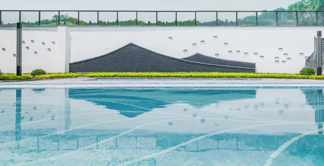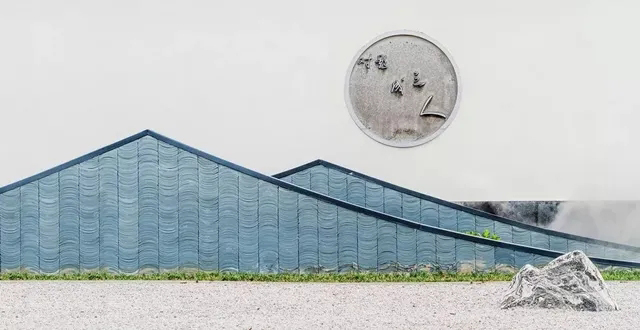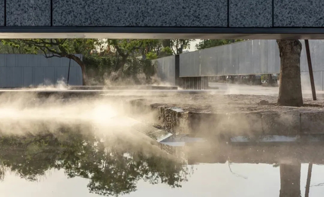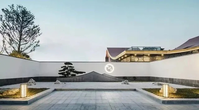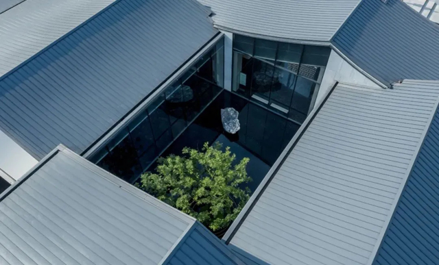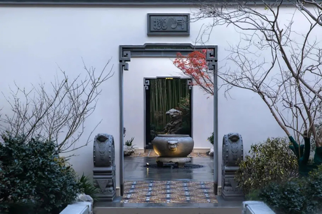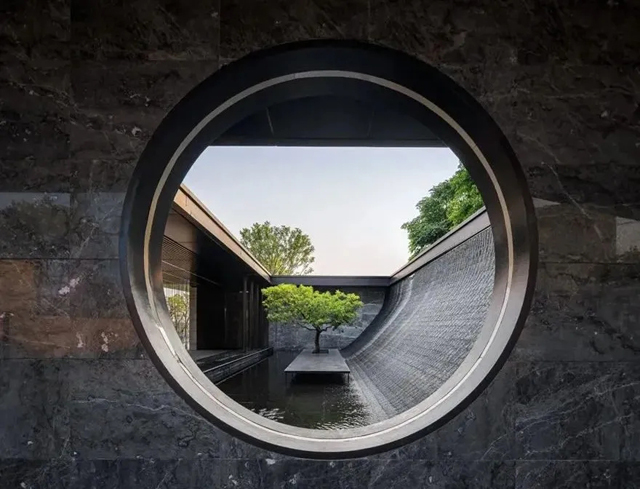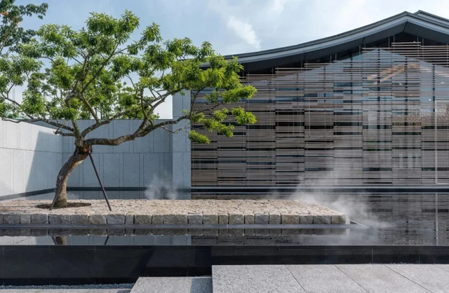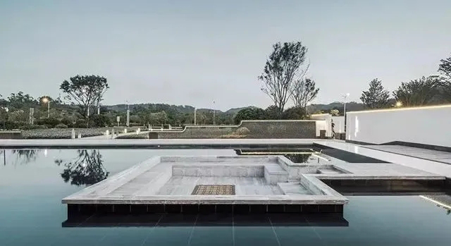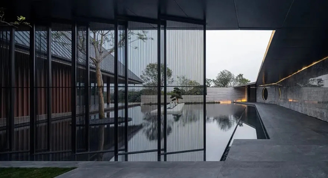镜面水景,一半铺青瓦,一半铺瓷砖,