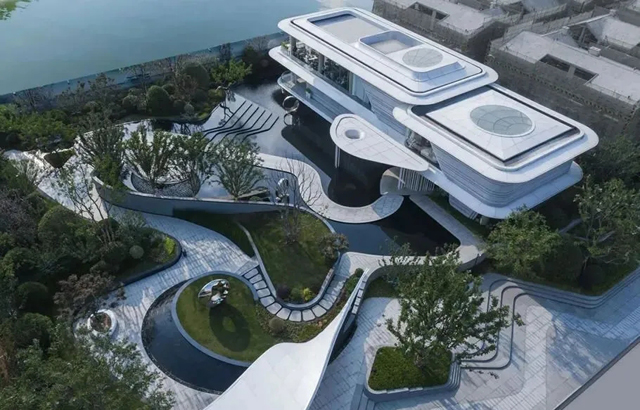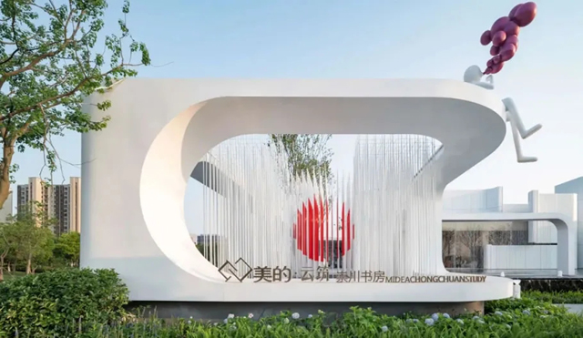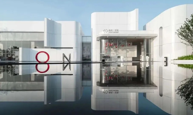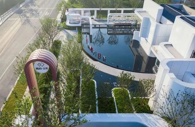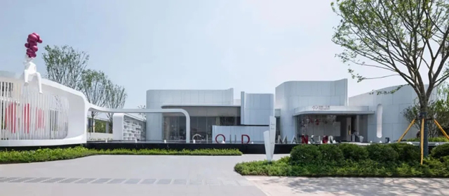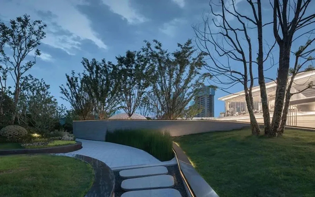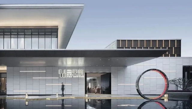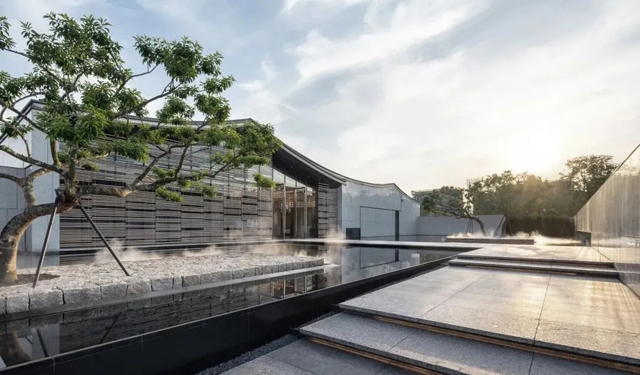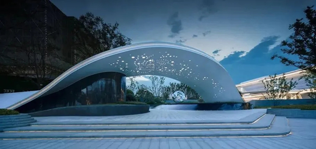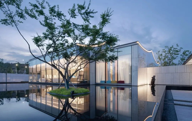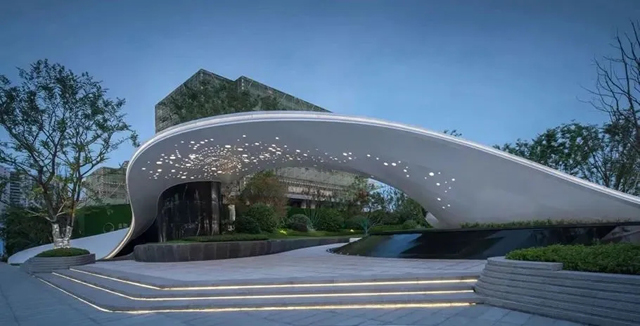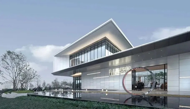同时售楼处前场运用弧形镜面水景烘托建筑。