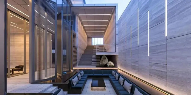 入口两侧及楼梯间处的白洞石与大面积通透空间,