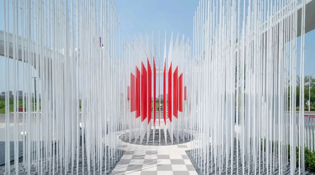 主题景观小品以白色钢构立柱营造积极向上的游乐空间,