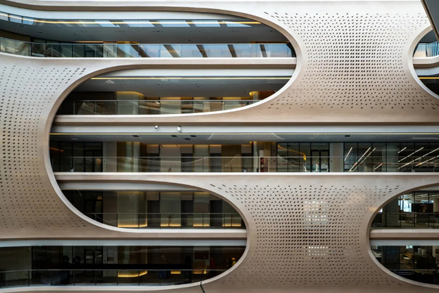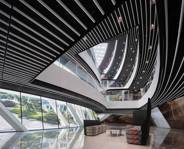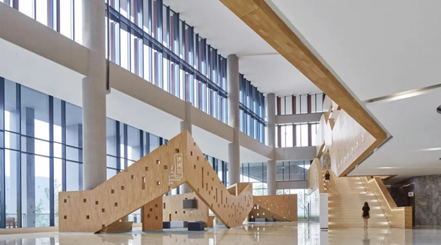 近人尺度的建筑构件将展示和交流融合在一起,也将大堂、中庭的开放和私密空间进行了重组和划分,既丰富了中庭空间的主体层次,又在近人的多重维度上强调了空间的韵律和构成母题。